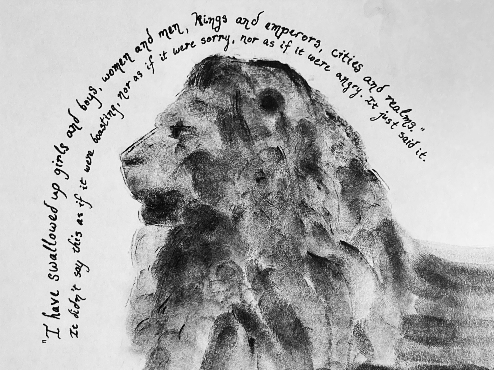 For chapter two, I went with the comparison of Aslan to the Trafalger Square lions, pairing it with Jill's sense of his power. The word that comes to mind is "austerity": he is stern, matter-of-fact, and an enforcer of discipline. He is a king who can take his leisure, who can make the claims he does without embellishment, who commands obedience, and for all that, is yet watchful. (He is, of course, also gentle and patient in this chapter, but it was his power that stood out to me this time around.)